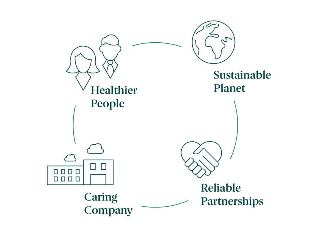Wir wissen jedoch, dass noch viel mehr erforderlich ist, um unsere Zielsetzung „Healthier life“ zu verwirklichen, sprich Nachhaltigkeit auf allen Ebenen unserer Unternehmensstrategie fest zu verankern. Wir sind uns unserer Verantwortung bewusst, die sozialen, ökologischen und wirtschaftlichen Auswirkungen unserer eigenen Geschäftstätigkeit und der Gesundheitsbranche im Allgemeinen zu überwachen, zu verstehen und entsprechend zu handeln. Aus diesem Grund stützt sich unser Nachhaltigkeitsansatz auf vier strategische Pfeiler: Healthier People, Sustainable Planet, Caring Company und Reliable Partnerships.